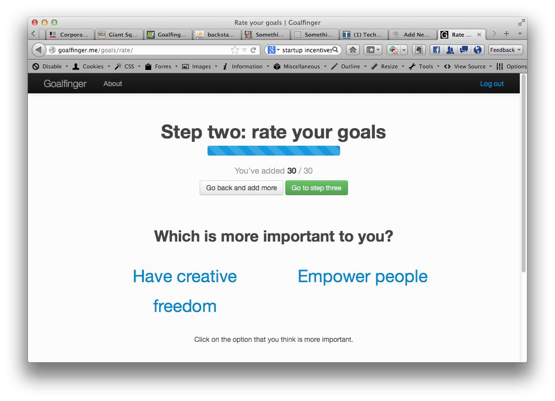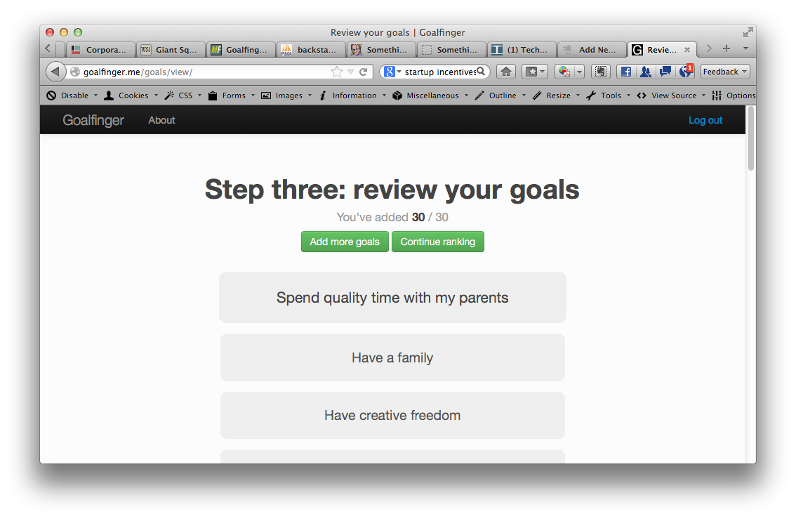 Once you've added enough goals, Goalfinger makes it easy to rank them, by only showing two at a time. This poses some surprisingly interesting questions:
