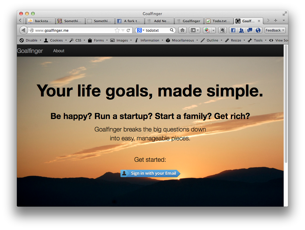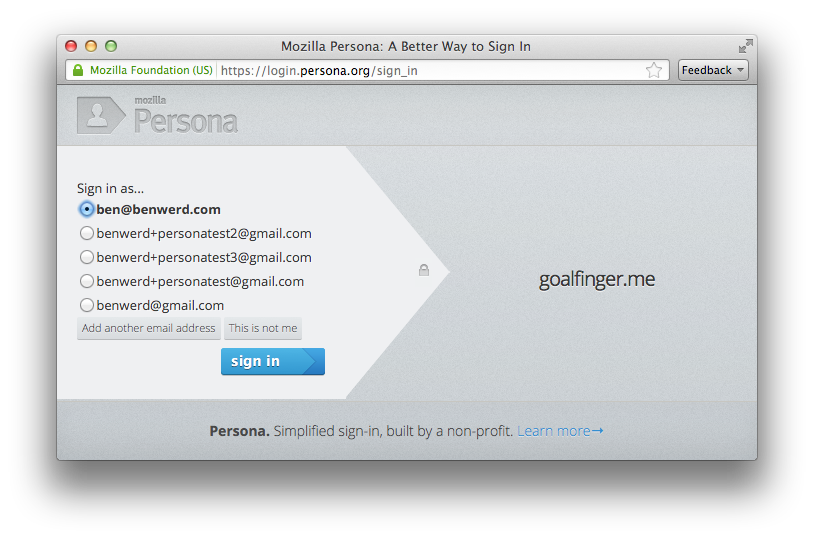 Goalfinger uses Mozilla Persona as its only authentication mechanism. I've been a fan of the Persona idea since its early days as BrowserID, and I wanted to see how well it worked in a real-life scenario. (I've also written an Elgg Persona plugin that allows you to attach Persona to your own Elgg-powered social network.)