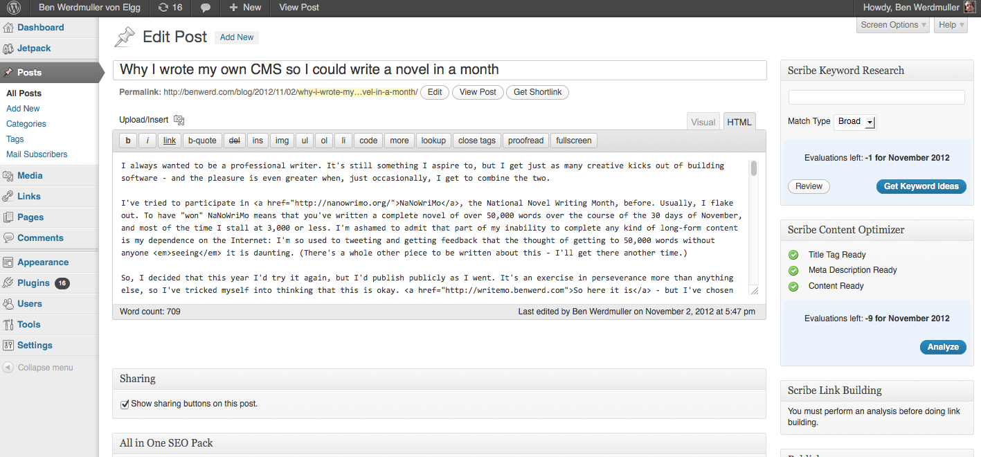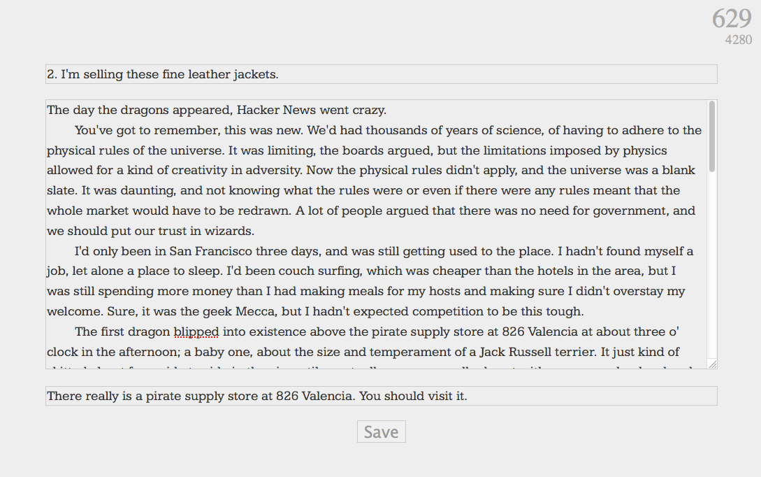 So, I decided that this year I'd try it again, but I'd publish publicly as I went. It's an exercise in perseverance more than anything else, so I've tricked myself into thinking that this is okay. So here it is - but I've chosen to write it a homegrown CMS rather than using Word or WordPress. I wanted to prominently see the word count as I typed, to track my progress towards 50,000 words. And I didn't want to deal with the increasingly-complicated WordPress interface (which I gladly use for this blog) or be tied to a single computer in the way I would be with Word. I also wanted to play around with some little bits of flair that would be hard with an existing piece of software.